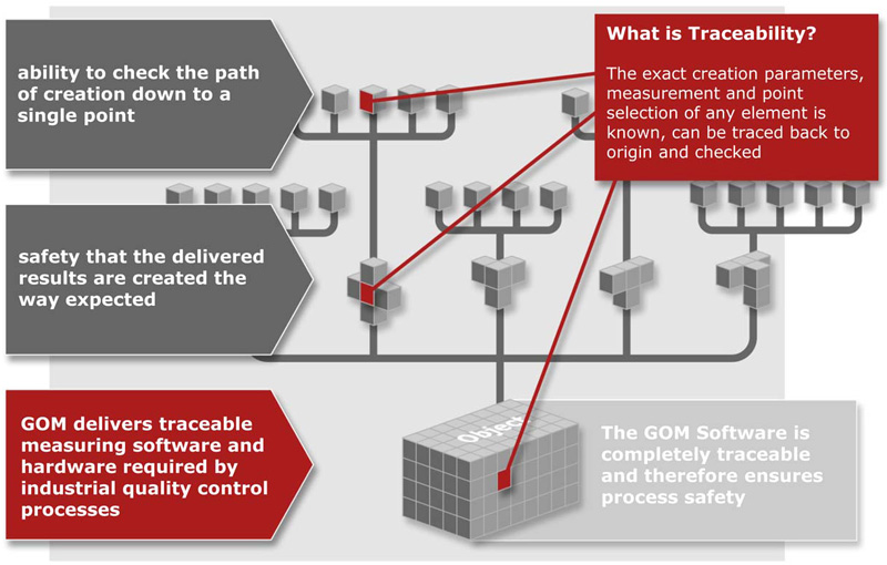 GOM Inspect Professional 軟件提供深入全面的溯源性,利于從結果追溯回元素的創建,從而提高工藝流程安全性。根據這個溯源性,可以精確溯回并檢驗任一元素的創建參數以及各次測量和各點的選擇。